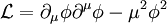 La ecuación K-G en teoría cuántica de camposEn teoría cuántica de campos el objeto fundamental no es la función de onda sino el propio estado físico del vacío o espacio-tiempo. Los campos físicos y las partículas materiales se conciben en este enfoque como operadores autoadjuntos definidos sobre el conjunto de estados del espacio-tiempo. La presencia de campo en una determinada región del espacio-tiempo comporta que el existe un operador autoadjunto asociado campo de esa región. En ese nuevo enfoque la variable el operador cuántico asociado a la variable La descripción de un campo en teoría cuántica de campos parte de una cierta densidad lagrangiana que a partir del principio de mínima acción proporciona la ecuación de movimento que define su evolución temporal. La densidad de Lagrangiano de la que se deriva la ecuación de Klein-Gordon variando la acción o mediante las ecuaciones de Euler-Lagrange es Donde el campo es real. En este caso la partícula que surje como excitación de este campo no tiene carga y su antipartícula es ella misma. Para describir una partícula escalar con carga, y a su antipartícula, la densidad lagrangiana se toma como: Se obtiene entonces una ecuación de Klein-Gordon para Solución generalSe puede hacer un desarrollo en ondas planas y la solución general para un campo real de Klein-Gordon es entonces Estando relacionada la energía con la masa y el trimomento mediante la relación de dispersión Las letras |