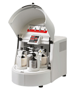 Con una capacidad útil de hasta cuatro veces 225 ml, el molino planetario es especialmente adecuado para grandes cantidades de muestras. Pueden procesarse simultáneamente hasta ocho muestras. El molino funciona con recipientes de molienda de 500 ml, 250 ml, 80 ml, 45 ml o 12 ml. Las cubetas y bolas de molienda están disponibles en seis materiales diferentes, de modo que puede evitarse específicamente la contaminación de las muestras por abrasión no deseada. Se dispone de tapas de inyección de gas para la molienda bajo gas protector, así como para la activación mecánica y la aleación.